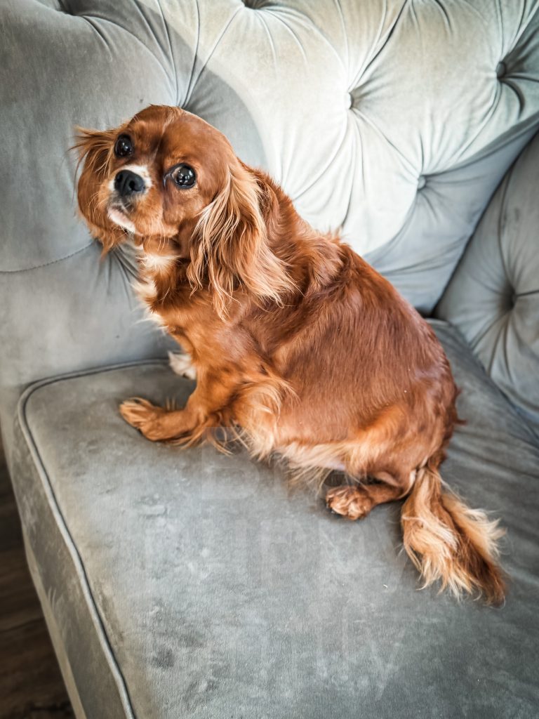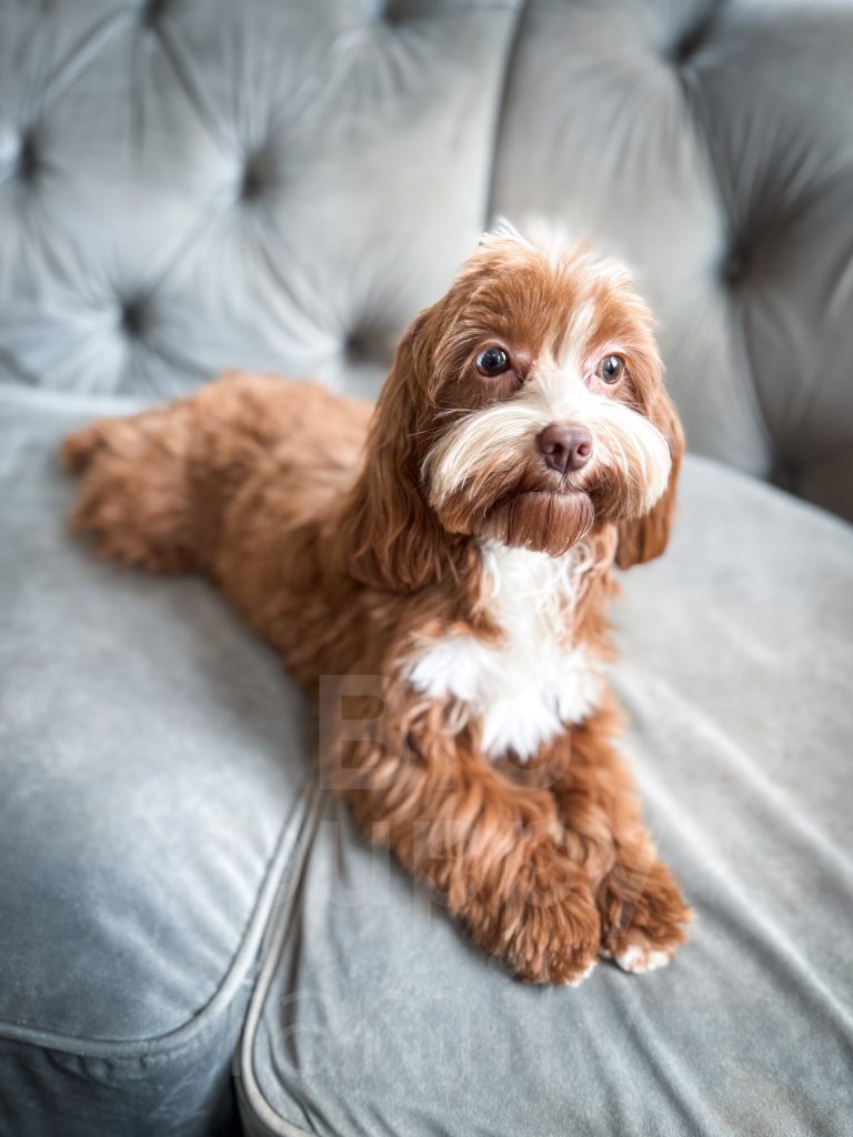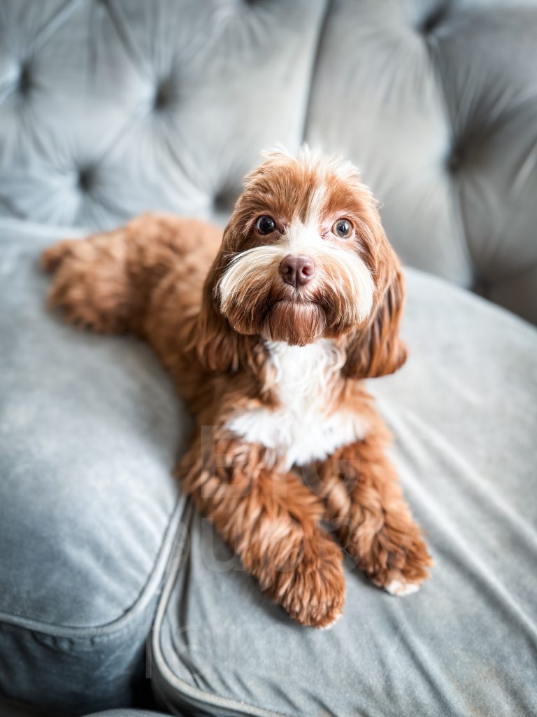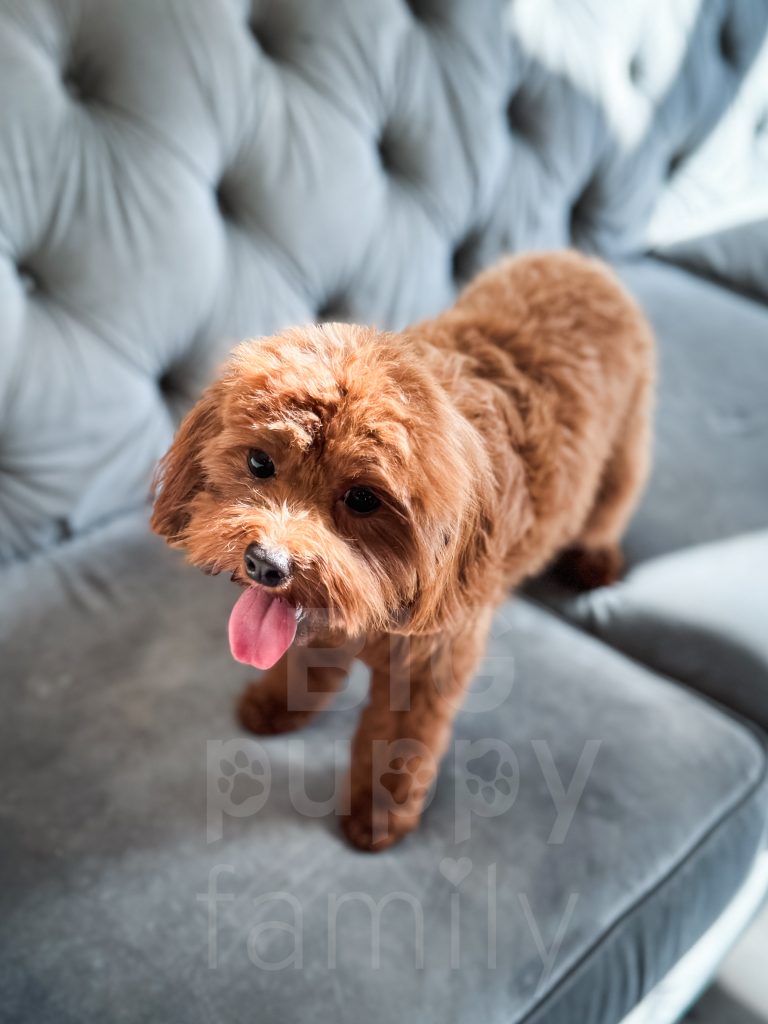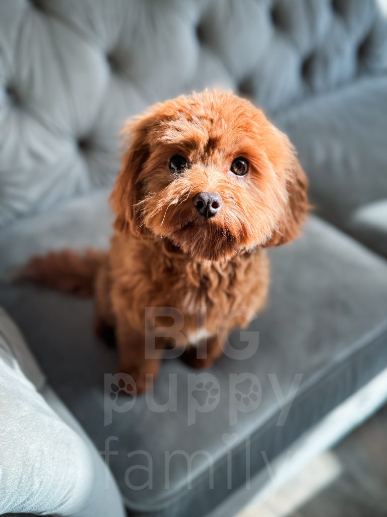 Danish is an adorable red cavapoo female whose mom is Waffles and whose dad is Rowan. She was born and raised with us. She has a perfect cavapoo personality. She’s friendly and playful and loves attention. She has the most beautiful dark red coat.