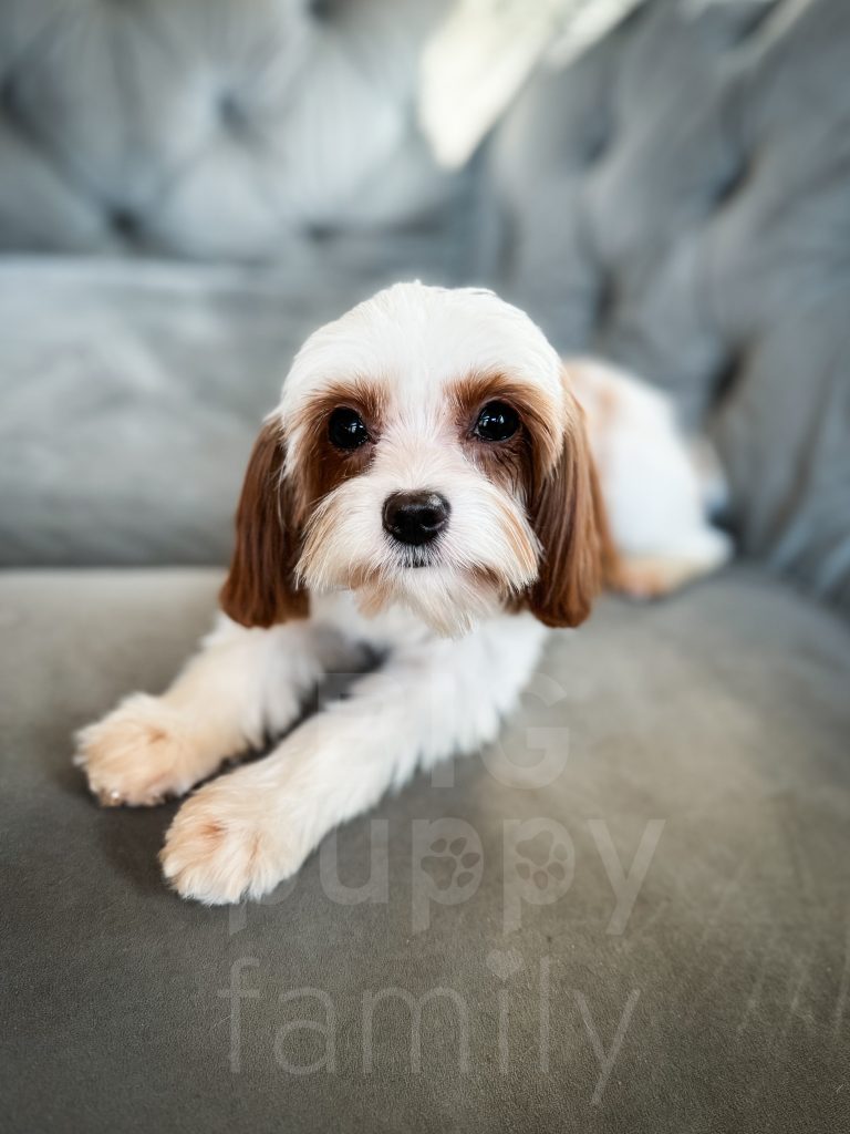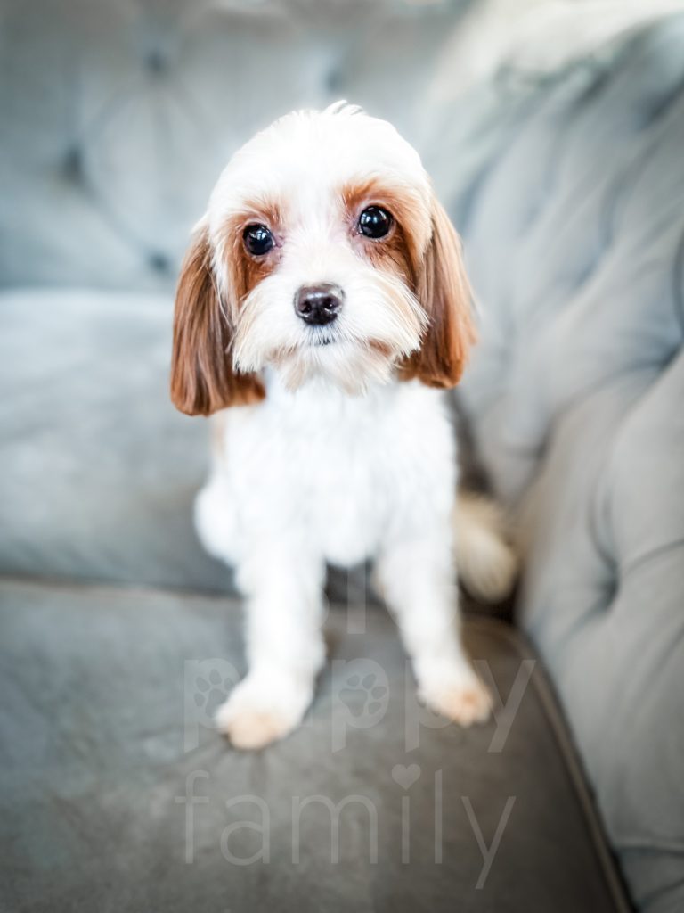 Valencia is a teeny-tiny 6/7 lb red parti reverse cavapoo female. Her mom is Tangerine, and her Dad is Felix. Val is very laid back and docile.