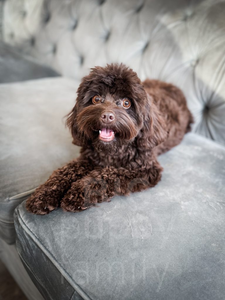 Noosa was born and raised here by us. She is the daughter of Roxy and Charlie. Noosa is silly and loving and offers her belly readily to anyone looking to pet her. She also has the softest, most amazing coat! Hopefully Noosa will be one of our brown cavapoo moms in late 2026/early 2027.