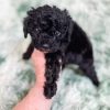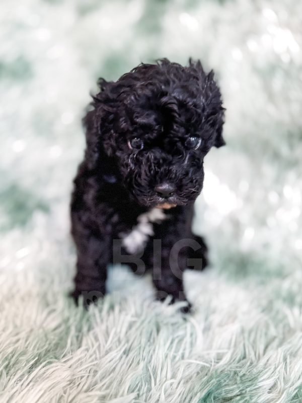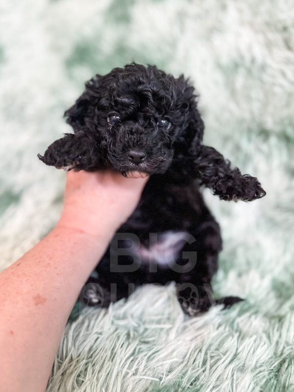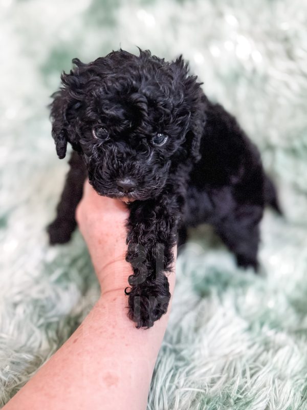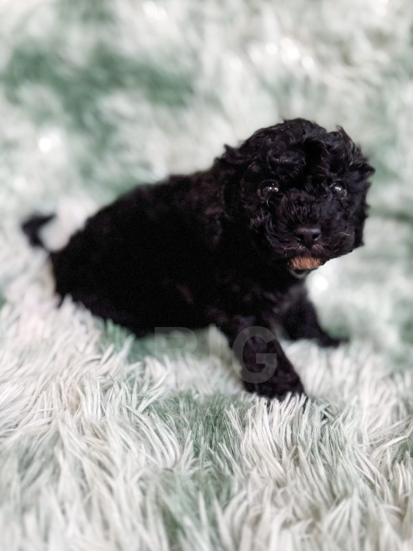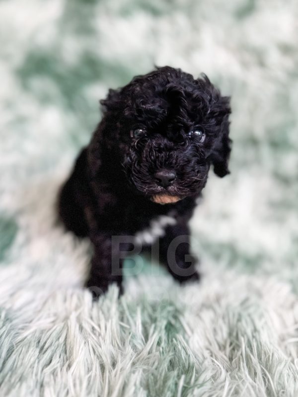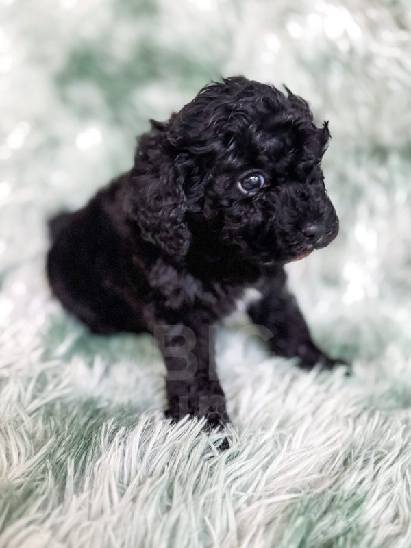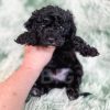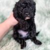 Amsterdam “Dam” was born on 3/16/26.  He is a beautiful black abstract (some small white markings) boy expected to be 15-20 lbs. His mom is our 25-lb Moyen poodle, and his dad is our 10-lb F1 phantom cavapoo, Koa. Dam has just the sweetest eyes and an “old soul” vibe to him.