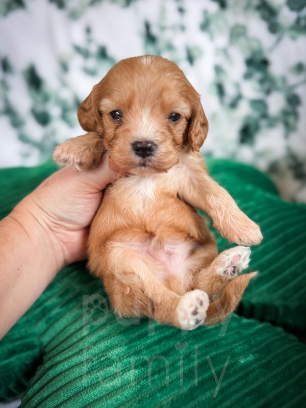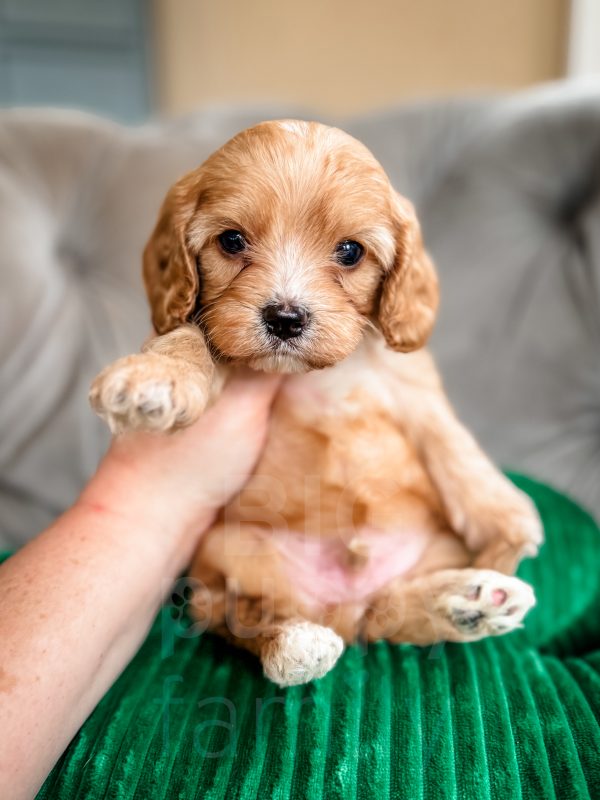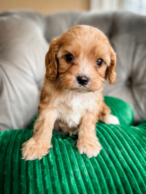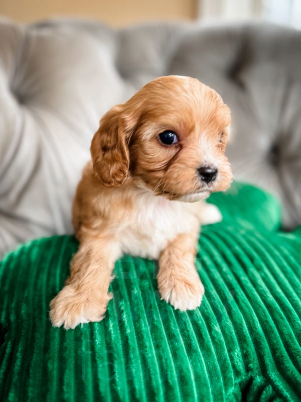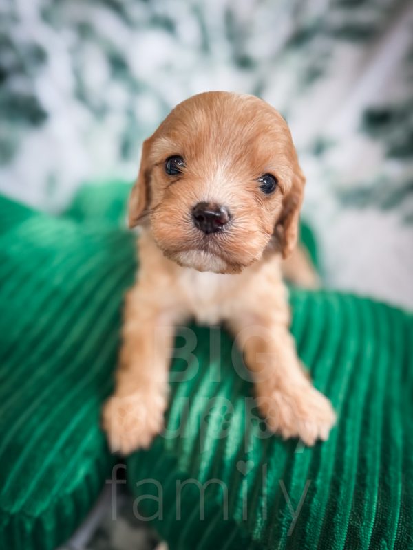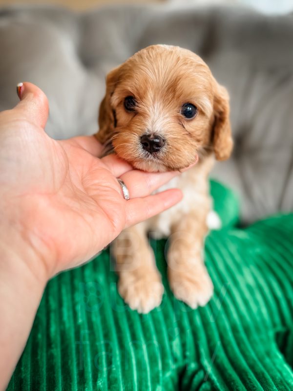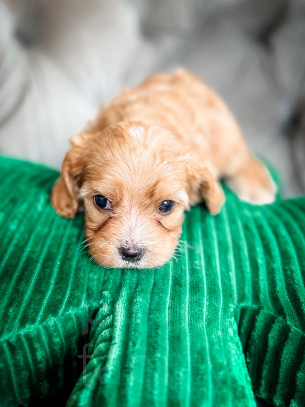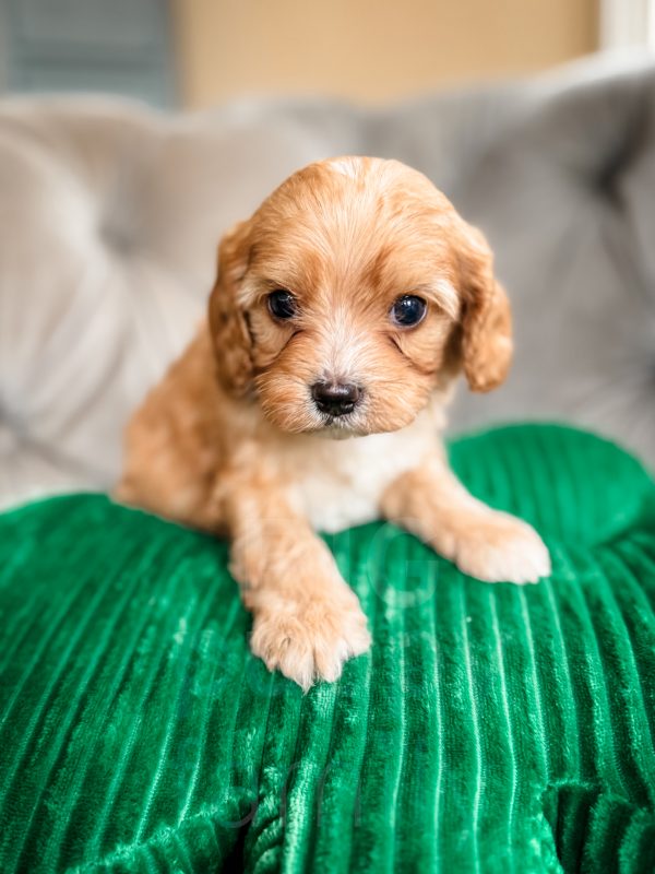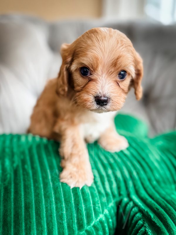 Chili is an adorable phantom male cavapoo born on 1/26/26. His mom is our 10-lb F1b cavapoo, Olive, and his dad is our 15-lb cavalier, Ozzie. We expect Chili to be in the 10-15 lb range as an adult.