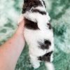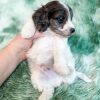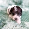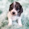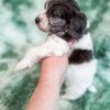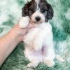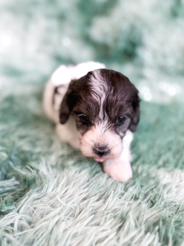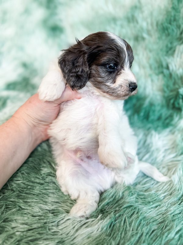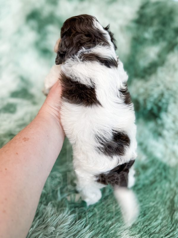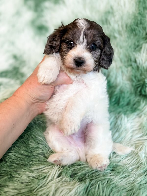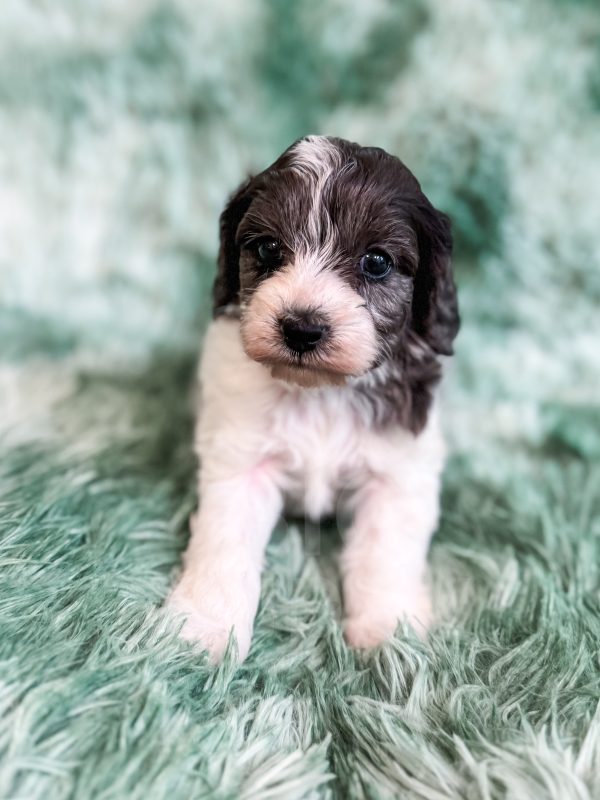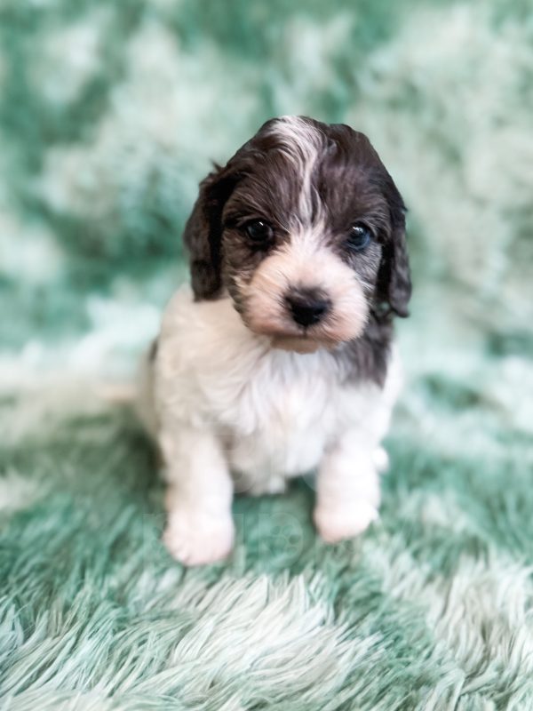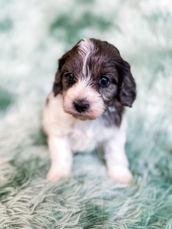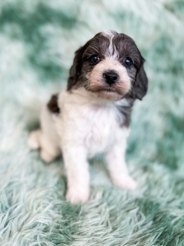 Manchester “Manny” was born on 3/16/26.  He is a beautiful black and white parti boy expected to be 15-20 lbs. His mom is our 25-lb Moyen poodle, Vanna, and his dad is our 10-lb F1 phantom cavapoo, Koa. Manchester has the cutest little Snoopy-looking face and is one of the only puppies to have a wavy (vs curly) coat.