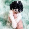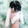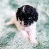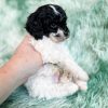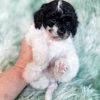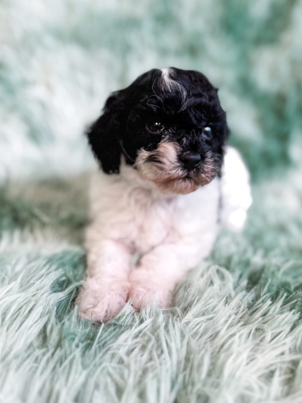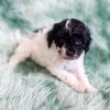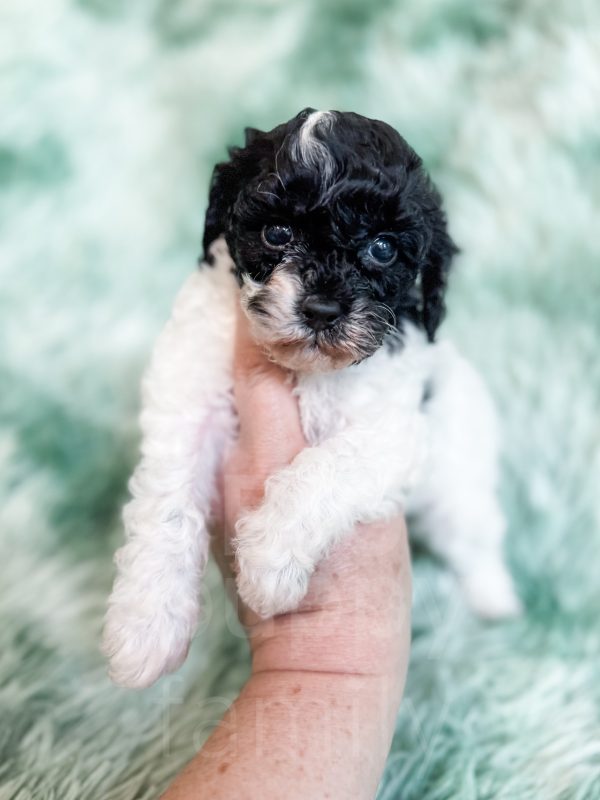 Nampula was born on 3/16/26.  He is a beautiful black and white parti boy expected to be 15-20 lbs, although he is currently the smallest in his litter.  His mom is our 25-lb Moyen poodle, and his dad is our 10-lb F1 phantom cavapoo, Koa.