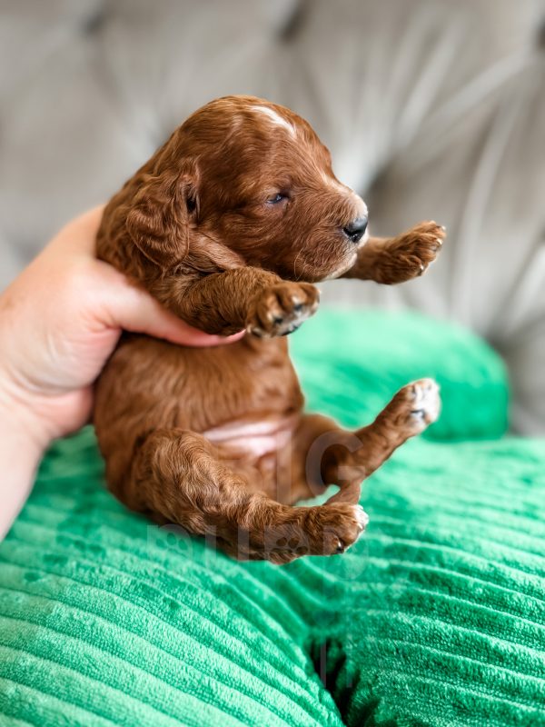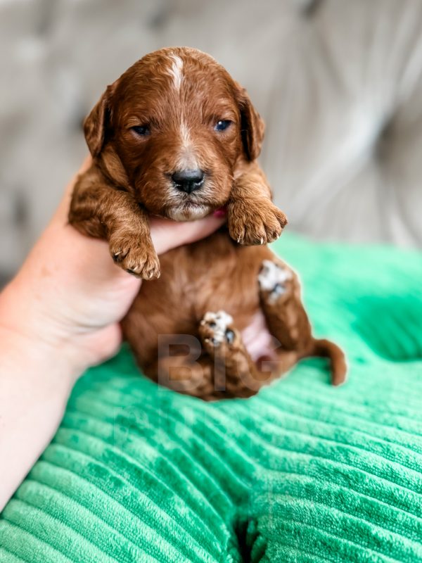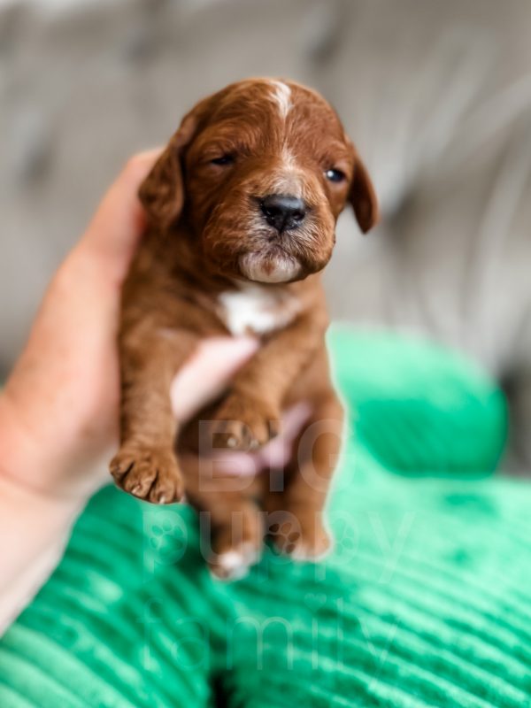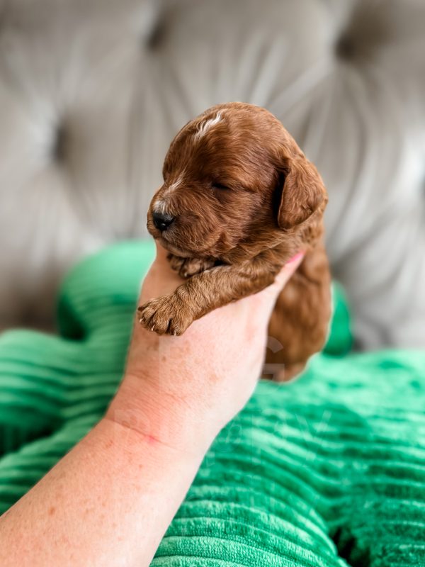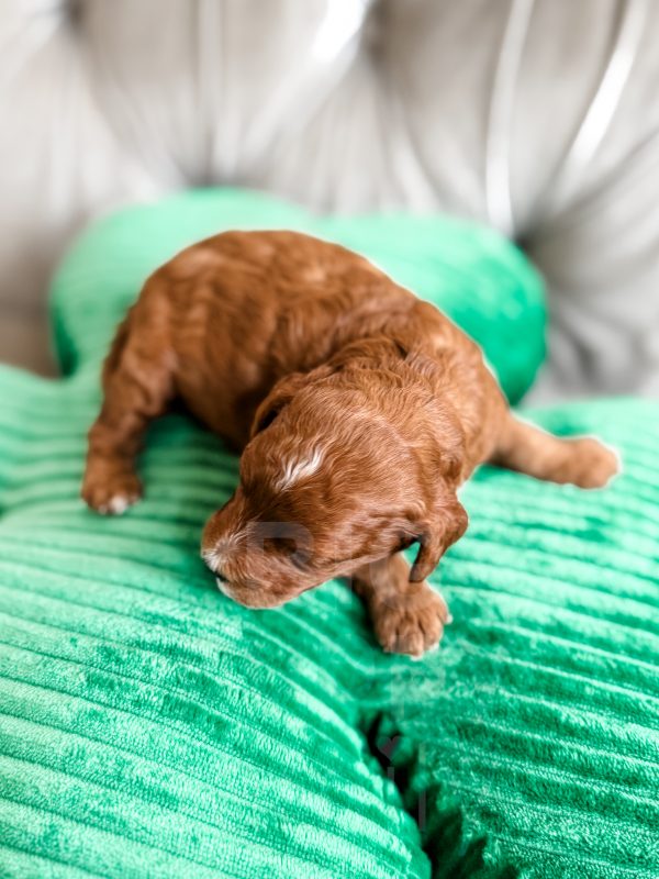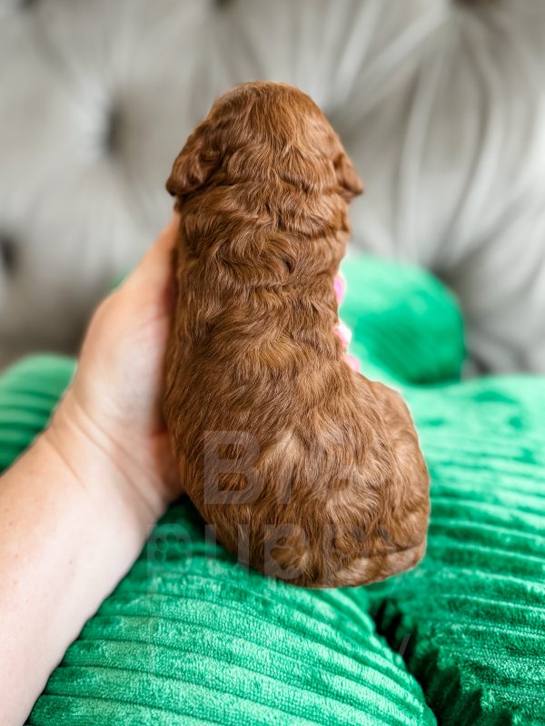 Rainbow and her sisters were born on 2/4/26. Their Mom is Clover, our 13-lb reverse cavapoo mom, and their dad is Grady, our 10-lb apricot poodle dad. We expect these babies to be 10-15 lbs full grown. They are F1bs but slightly more cavalier percentage than an F1b because their mom is a reverse Cavapoo. Their coats will be the same as F1b cavapoos.