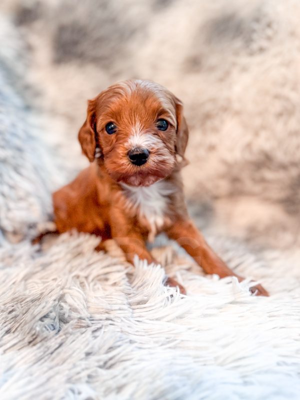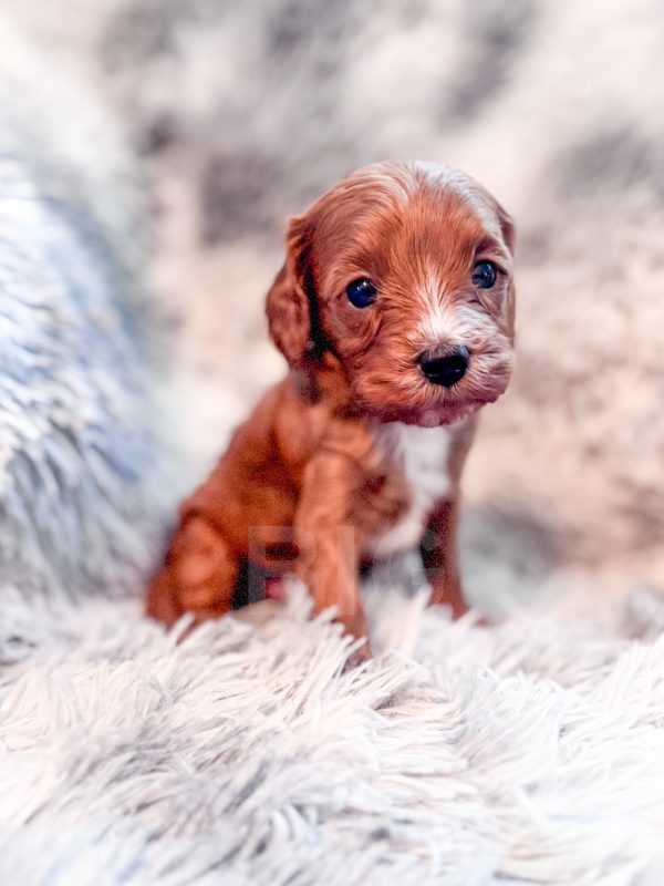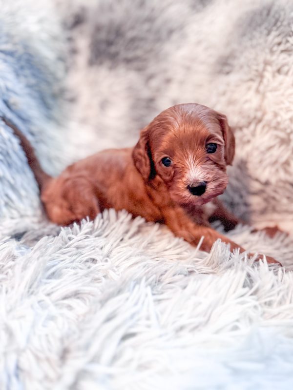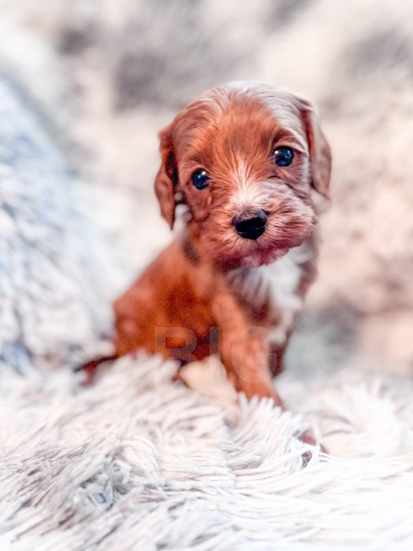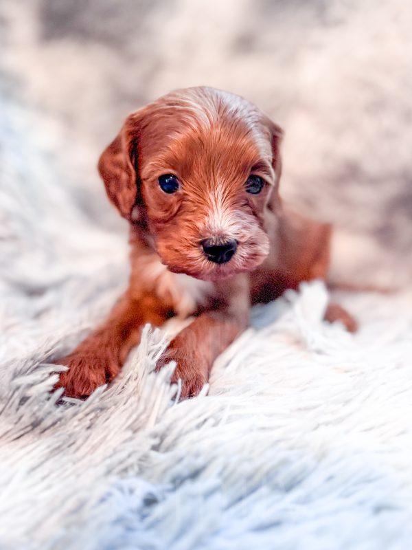 Rigatoni “Rigi” and his littermates were born on 3/25/26. Their Mom is our 10-lb F1 cavapoo, Lottie, whom we bred from two our our absolute favorite parents (Cali x Felix). Dad is our 8-lb red mini poodle, Rowan. We expect these babies to mature to 8-12 lbs.